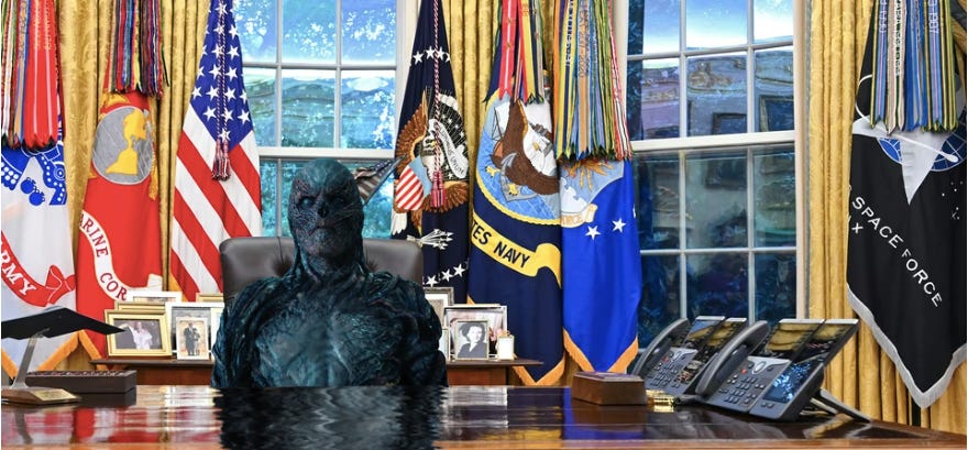 In the Stranger Things universe, there was a god damn Mind Flayer in an alternate dimension set to destroy planet earth as we know it and replace it with some fucked up Vecna-envisioned “upsidedown” world and the US was sooner worried about… fighting Russia. It would be laughable if we didn’t witness the same damn scenario - in bipartisan fashion - in our own world.